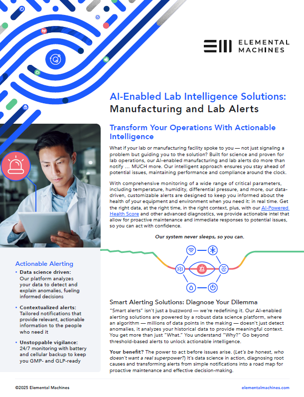 Transform your operations with our AI-powered solutions for labs and manufacturing facilities. Find out how you can optimize your efficiency in real time with informative alerts and our AI-Predicted Health Score. Get insights from our new one-pager.