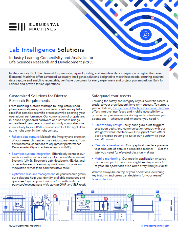Enhance your lab’s connectivity with Elemental Machines’ innovative R&D IoT solutions. Download our one-pager to discover how our platform ensures precision, reproducibility, and seamless data integration for superior operational excellence.
